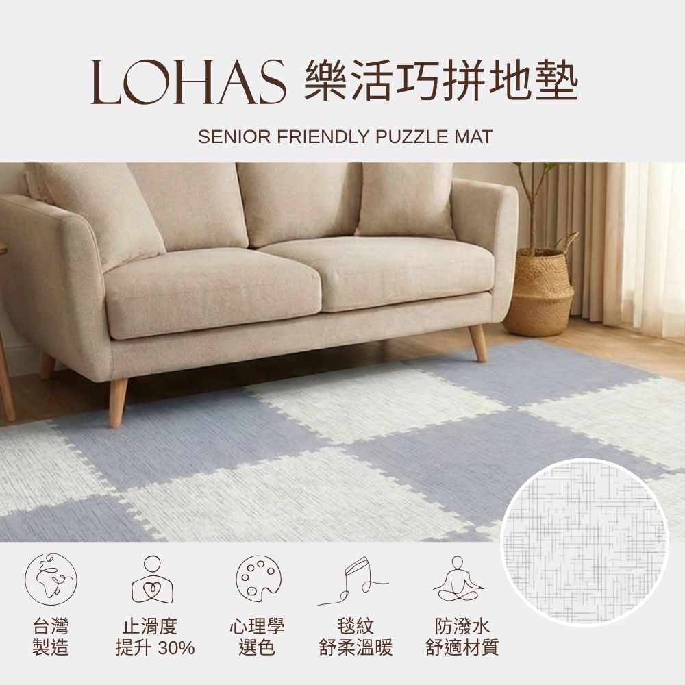 隨著年紀增長,骨骼和肌肉逐漸退化,走路時的穩定性也會受到影響。一般的巧拼地墊,太薄了保護力不夠,太厚太軟又會讓行走變得不穩,反而增加跌倒的風險。我們推出這款樂活巧拼,硬度設計在30-35度之間(一般巧拼約35-40度),比一般巧拼多一些柔軟度,踩起來舒適又不會太軟,讓長輩走得更安心、更穩當。